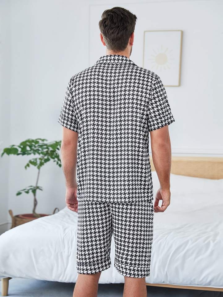 Summer Short 2 Piece Men's Sleepwear Houndstooth Plaid Print Loungewear Shorts Custom Cotton Mens Pajamass